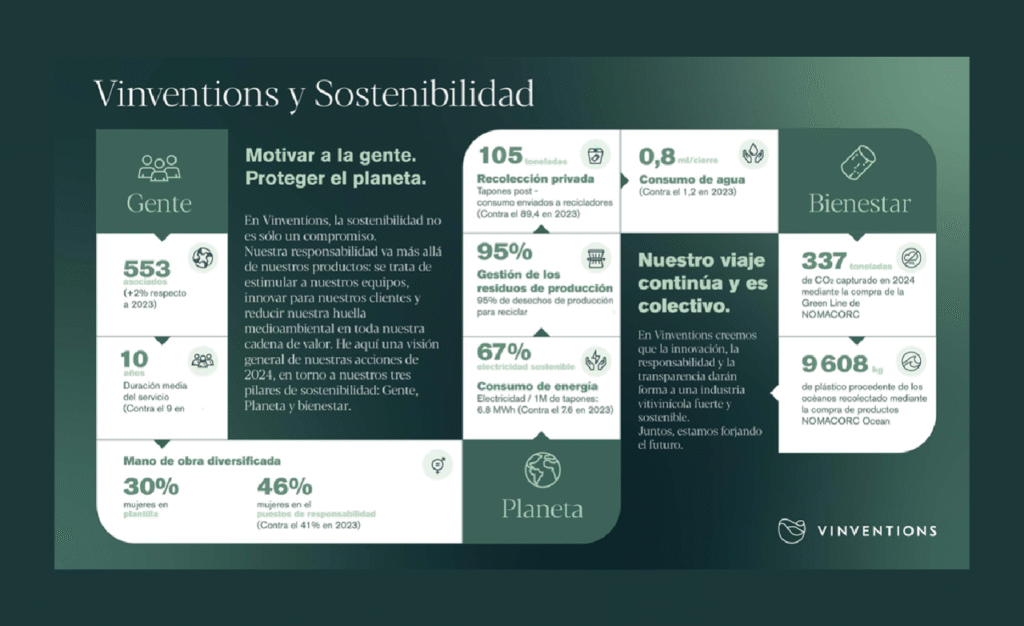 El informe de 2024 detalla los esfuerzos y resultados de Vinventions en su compromiso con el medio ambiente y la sociedad. Algunos de los logros más destacados incluyen: