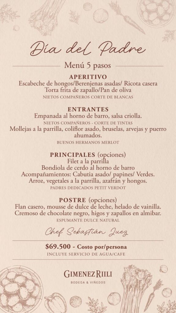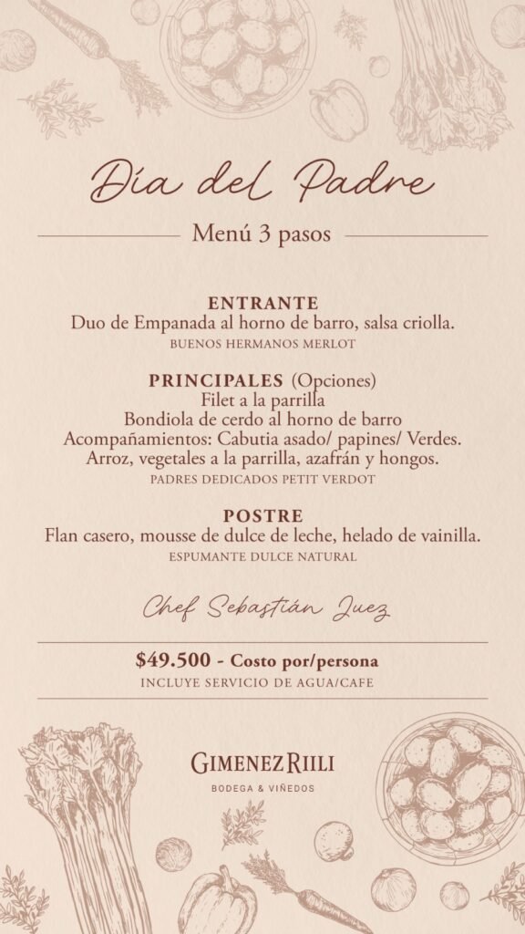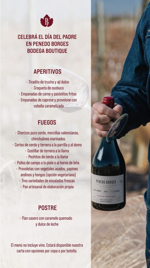 La elegante bodega de calle Brandsen, en Luján de Cuyo, ofrece un 25 % de descuento para el domingo en los precios de sus menúes (en la lista a contnuacio´n están los precios base y de allí hay que hacer el descuento con cualquier medio de pago), y de regalo para papá una botella de Punto Final Sauvignon Blanc de regalo.