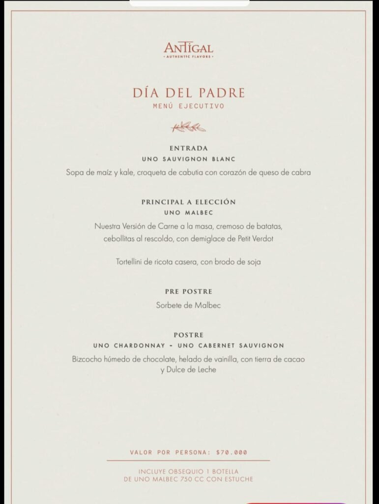 • En tanto, Bodega Antigal ofrece un menú especial por un valor de $70.000 por persona en el que va incluida de regalo una botella de UNO Malbec con estuche, y la visita guiada a la bodega con degustación sin cargo.