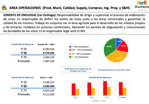 La conclusión es que el salario de un Gerente Enológico en una bodega grande (entre 201 y 500 empleados) está en torno a los 7 millones de pesos, mientras que el mismo puesto en una pyme rondará los 4 millones de pesos.