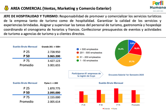 En el rango de Jefe de Turismo / Hospitalidad, los salarios brutos rondan, en promedio, 3 millones de pesos mensuales en bodegas grandes y 2 millones de pesos en bodegas chicas.