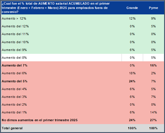 En este escenario de incertidumbre en las ventas, la mayoría de las empresas confirmo que están siendo muy cautas en los ajustes salarios dentro primer trimestre (Inflación acumulada 15,1% y el 80% de las empresas no llegaron a acompañar ese porcentaje (en promedio estuvieron en un valor más cercano al 12% y un 25% de las empresas no dieron aumentos en el primer trimestre).