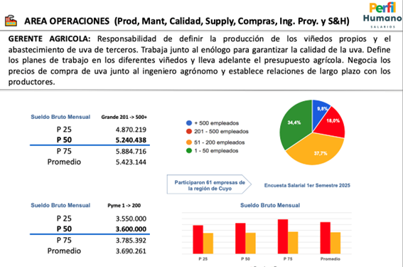 El salario de un Gerente Agrícola, que se encarga de viñedos propios y uvas de terceros, se ubica en torno a los 5,5 millones de pesos en bodegas grandes, mientras que las pymes estarían pagando sueldos brutos en esta posición de 3,6 millones de pesos.